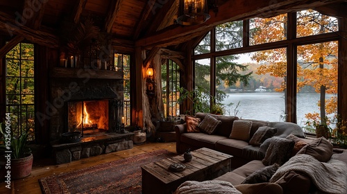 A cozy wooden cottage with a fireplace and large windows offering views of a serene lake and forest in autumn colors