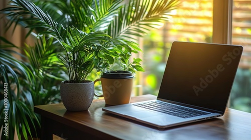 A cozy workspace featuring a laptop, potted plant, and coffee cup, illuminated by warm sunlight through a window.