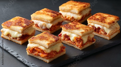A creative flat‑lay of kimchi grilled cheese sandwiches on dark ceramic tiles, cut to reveal melted cheese and spicy kimchi layers, under crisp lighting for edgy fusion food blogs
