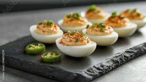 A creative take on a deviled eggs platter, featuring halved hard-boiled eggs filled with a smooth, seasoned yolk mixture, topped with paprika, chopped chives, and a small slice of pickled jalapeño,