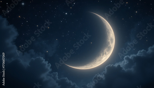 A crescent moon shines brightly in a dark, starry night sky, surrounded by fluffy clouds.