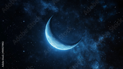 A crescent-shaped celestial body, possibly a planet or moon, is illuminated from behind, casting a radiant blue glow against the vast expanse of space. The backdrop is dotted with numerous twinkling