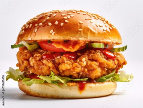 crispy, fried, chicken, burger, melt, closeup, shot, food, satisfying, delicious, appetising, tempting, mouth-watering, tasty, deliciously, savoury, flavorful, juicy, grilled, bun, cheese, lettuce, tomatoes, mayo, sauce, fast food, snack, lunch