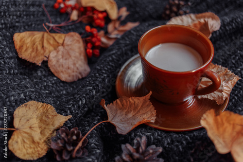 A cup of coffee on the Dars gray knitted sweater with colorful fall maple leaves and pine cones. Autumn cozy background.