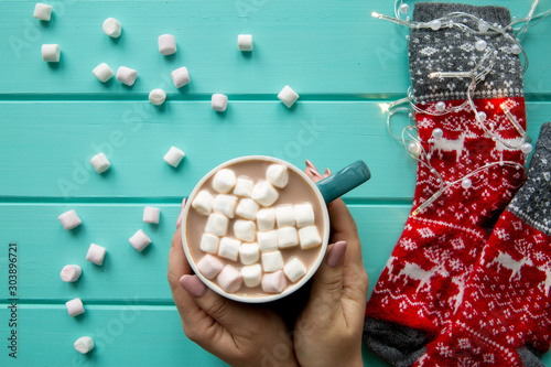 A cup of tasty cocoa with marshmallow, top view. Winter deer ornament traditional socks.