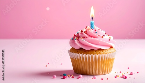 cupcake, pink, cake, dessert, sweet, birthday, celebration, treat, party, frosting, candle, lit, sprinkle, colourful, pastry, bakery, food, deliciously, delicious, vanilla, icing, decoration, festive, joyful, candy, sugar, baked, good, confectionery, confection, edible, flames, fire, burning, whimsical, vibrant, cheerful, bright, clean, simple, minimalistic, photo, still, life, closeup