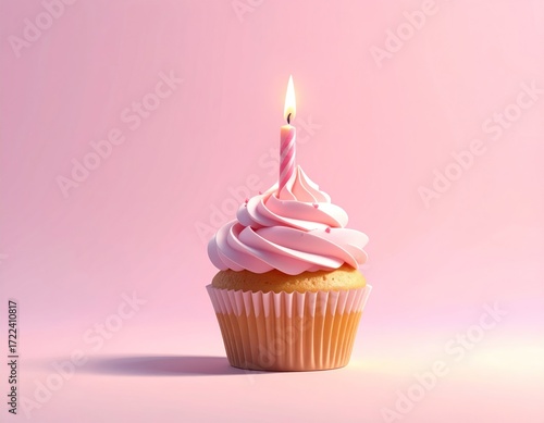 A cupcake with pink frosting and a striped candle, set against a soft pink background. Soft light and shadows give it a dreamy aesthetic