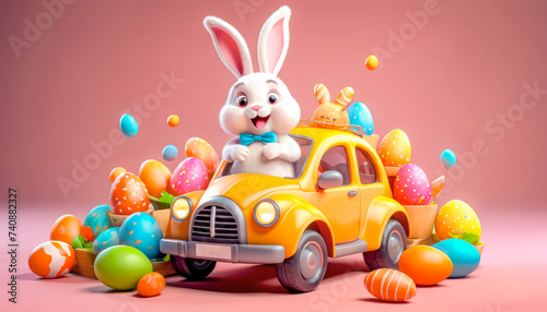A cute and cheerful Easter bunny is carrying Easter eggs and sweets in a car
