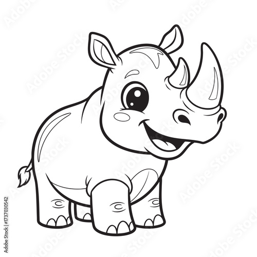 A cute and happy baby rhinoceros cartoon character black and white line art for coloring.