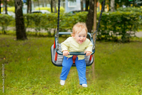 A cute baby child having fun on a swing