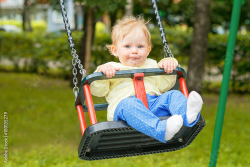 A cute baby child having fun on a swing