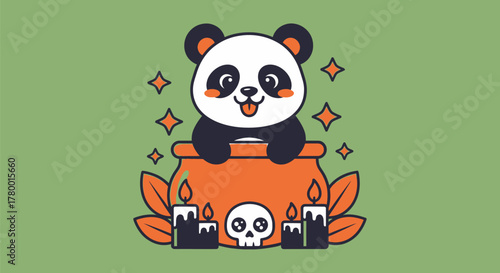 A cute cartoon panda sitting in an orange cauldron with candles, a skull, and leaves, on a green background, with a Halloween theme.