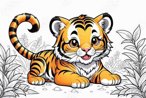tiger, baby animal, cartoon, animal, cute, playful, orange, black, stripes, fur, wildlife, nature, paw, whisker, eye, smile, grass, leaf, illustration, character, art, design, adorable, happy, young, vibrant, fun, jungle, habitat, creativity, colourful, friendly, environment, tail, ear, expression, scene, background, exotic, species, children, entertainment, drawing, image, joyful, charming