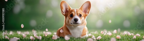A cute corgi dog lays in a field of green grass and pink flower petals.