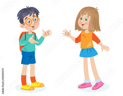 children, cartoon, boy, girl, talk, children, happy, art, character, goggles, cheerful, backpack, childhood, conversation, cute, drawing, friends, gesture, glad, greeting, hilarious, holiday, illustration, isolated, joy, children, little, 2, people, play, poster, print, pupil, school, secret, smile, summer, together, vector, walk, white, background, young, youth, education, acquaintance, pair, teenage, funny