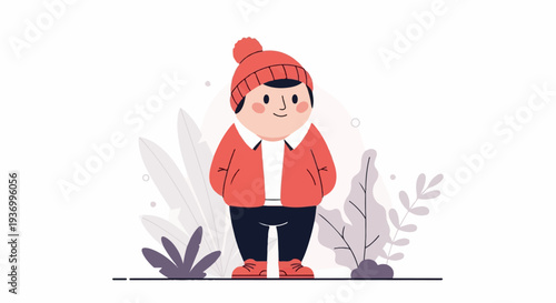 cute, person, red, hat, coat, plant, standing, white, background, cartoon, illustration, drawing, character, happy, cheerful, simple, modern, graphic, design, art, clean, minimal, profile, front, view, winter, clothing, casual attire, style, outfit, fashion, childhood, youth, outdoors, nature, foliage, leaf, stem, round, element, dot, circle, friendly, approachable, gentle, warm, cosy, comfortable, relaxed