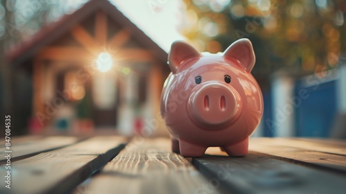 A cute pink piggy bank with a home house