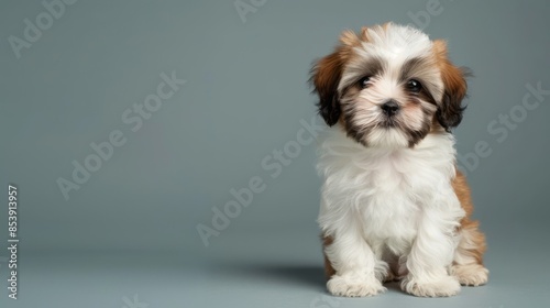 A cute Shih Tzu puppy sitting on a solid pastel Grey background with space above for text