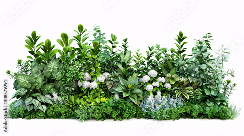 A cutout flower bed, designed for garden landscaping, isolated on a white background. Flowering shrubs and green plants with a decorative hedge. High-quality clipping mask.