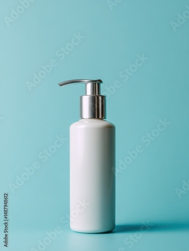 A cylindrical white bottle with a silver pump dispenser stands against a light teal background, ready for your product label design. : Generative AI