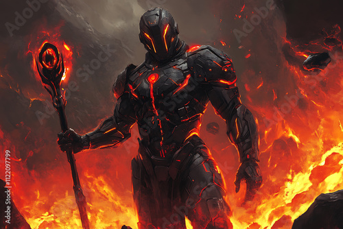 A dark and powerful Hades in futuristic red glowing cyber armor, holding a cybernetic staff, standing amidst glowing lava rivers in a fiery underworld