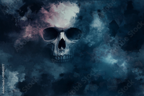 A dark, eerie skull partially obscured by swirling clouds, creating a haunting and mysterious atmosphere.