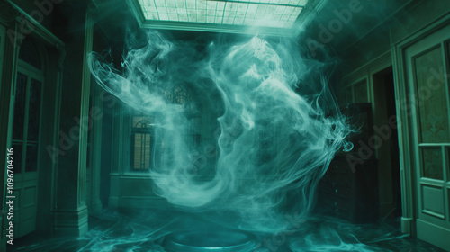 A dark fantasy movie still of the most beautiful, translucent, ghostly smoke in hues of teal, swirling and forming into shapeless figures floating above an ethereal ocean with black water.