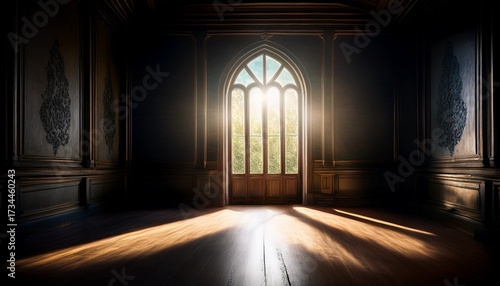a dark room with a light shining through the window sharp volumetric lighting