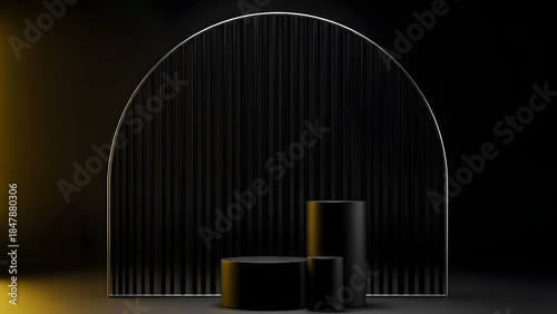 dark, room, metallic, arch, cylindrical, object, foreground, blurry, image, art, design, minimalist, modern, architecture, interior, decor, style, lighting, shadow, shape, form, space, black, background, detailed, visual, abstract, concept, industrial, sculpture, installation, exhibition, gallery, atmosphere, mood, light, texture, visualisation