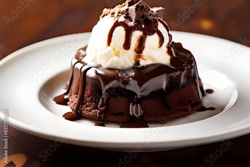 A decadent chocolate dessert topped with a scoop of creamy vanilla ice cream.