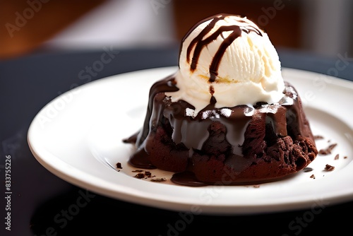 A decadent chocolate dessert topped with a scoop of creamy vanilla ice cream.