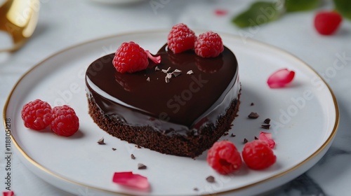 A decadent heart-shaped cake with dark chocolate ganache and fresh raspberries on top