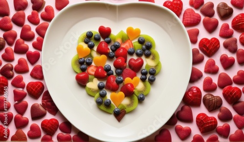 A decadent Valentine's Day spread featuring a heart-shaped chocolate dessert, surrounded by strawberries, chocolate candies, and heart-shaped decorations.