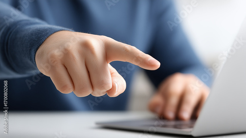 A decisive pointing hand at a laptop signaling selection and accountability, illustrating decision making and user focus in digital interactions.
