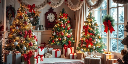 A decorated Christmas tree with colorful presents underneath in a festive living room setting, decorations, December