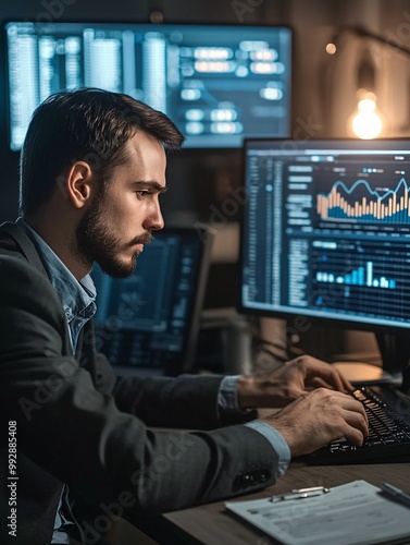 A dedicated actuary meticulously examines data visualizations in a sleek workspace filled with analytical reports and statistical frameworks, showcasing expertise and accuracy.