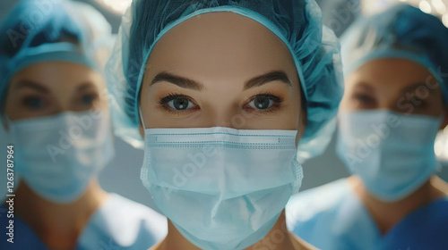 A dedicated emergency surgery team working seamlessly in a hospital, showcasing their skill and teamwork in masks.