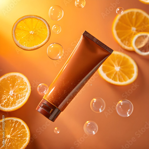 A deep amber-colored cosmetic tube floats mid-air, slightly angled.