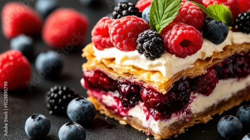 A delectable pastry layered with cream, berries, and flaky pastry, perfect for dessert lovers and a beautiful addition to any sweet table or event, evoking joy and indulgence.