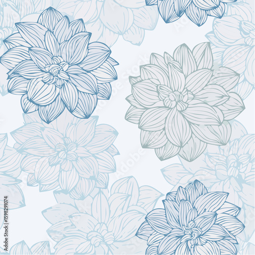 A delicate seamless vector pattern featuring hand-drawn blue dahlia flowers. An elegant vintage floral line art background illustration.