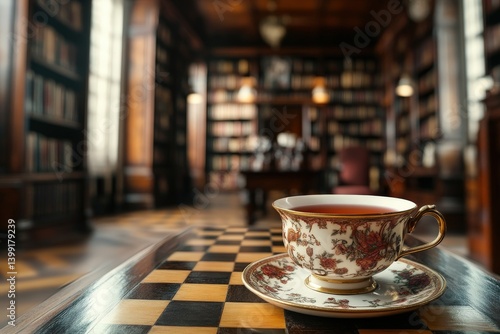 A delicate teacup sits on a chessboard table in a grand library.
