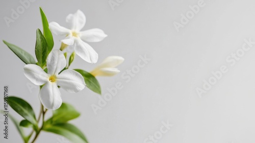 delicate, white, jasmine, pale, grey, background, closeup, shot, minimalist, style, photo, fragrant, flower, serene, clear, centered, space, text, high, quality, image, highlighting, elegant, bloom, subtile, fragrance