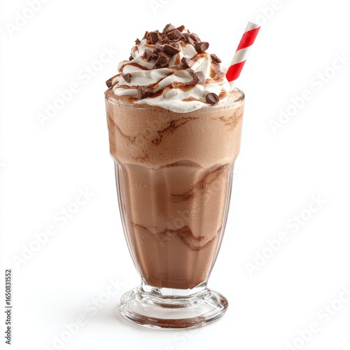 A delicious chocolate milkshake topped with whipped cream and chocolate shavings, perfect for a sweet treat!