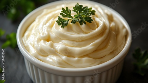 a delicious creamy mayonnaise in a white bowl