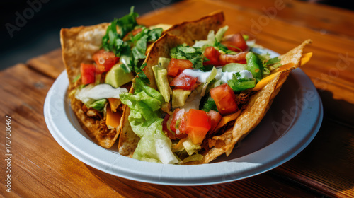A delicious plate featuring two taco shells filled with fresh vegetables, meat, and toppings, served on a disposable plate.