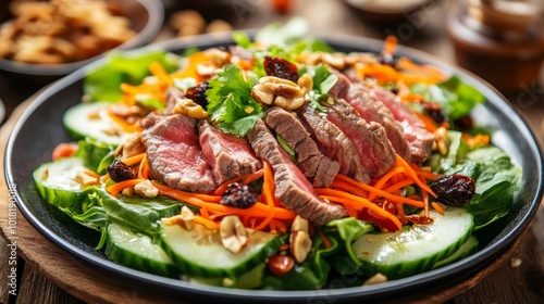 A delicious salad with grilled steak, carrots, cucumber, dried cranberries, and chopped nuts.