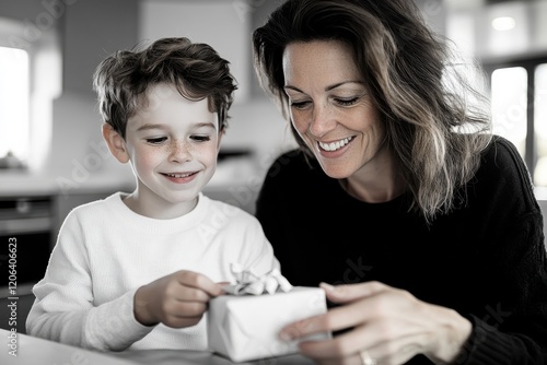 mother, son, gift, family, joy, celebration, warmth, cheerful, delight, happiness, bonding, togetherness, excitement, smile, childhood, love, portrait, lifestyle, indoor, festive, unwrapping, caring, nurturing, playful, memory, gift box, wrapped, bow, together, oneness, home, fun, experience, anticipation, joyfulness