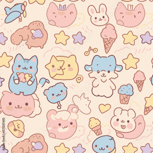A delightful seamless pattern featuring an assortment of adorable pastel-colored cartoon animals and whimsical objects on a soft background, perfect for children's designs.