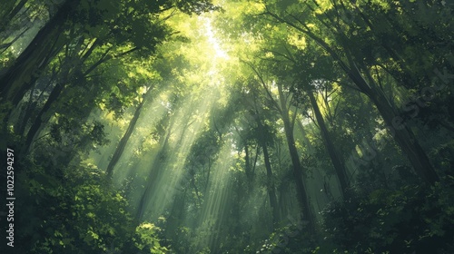 A dense forest filled with towering trees, sunlight filtering through the thick canopy