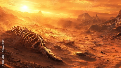 landscape, desert, dinosaur, remain, skeleton, sun, orange, dust, sand, mountain, hill, fossil, ancient, dry, arid, hot, warm, gold, light, shadow, huge, empty, still, scene, nature, ruin, horizon, background, texture, detail, paleontology, extinct, creature, bone, detail, sunlight, cliff, rock, shadow, dramatic